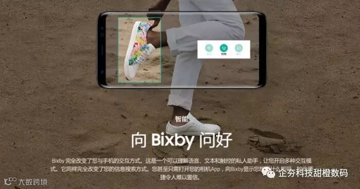 在相机App里有个和Bixby相关的增强现实按钮,它可以把相机取景框里的物体识别出来,之后可以直接进行搜索,这是个很直接AR应用。当你的摄像头对准你的鞋子取景,它会识别出你的鞋子是什么型号,然后可以跳转到亚马逊(国内应该是淘宝)搜索同样的商品,有点像淘宝的那个以图片搜索商品的功能。