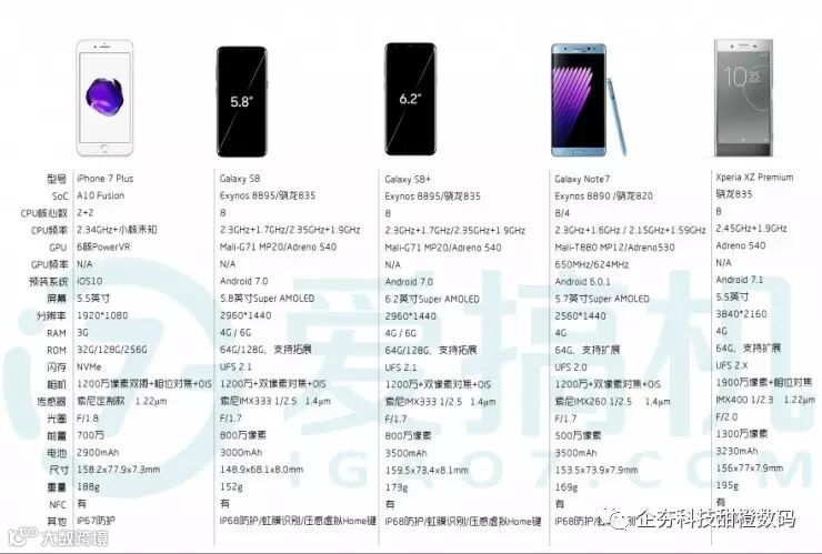 高通骁龙 835 或三星 Exynos 8895+4/6GB+64/128GB(美版暂时只公布了4+64G一个版本)