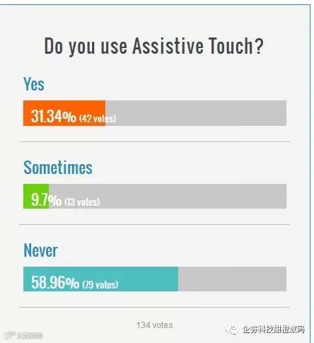 PhoneArena的最新统计显示,如今,高达58.96%的人从来不用“小白点”,经常用的是31.34%,偶尔用的是9.7%。