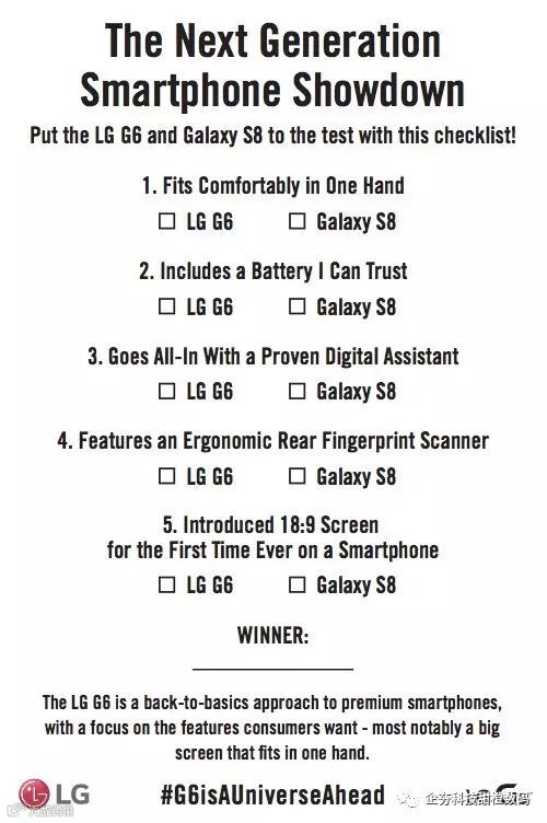 尽管三星希望大家极力淡忘 Galaxy Note 7 电池燃损召回停产事件,并以采用突破性设计的 Galaxy S8 挽回颜面,但是它在老家的竞争对手 LG 却仍然不忘揭开这道伤疤。在周三的 Unpacked 发布会上,三星正式公布了艳惊四座的 Galaxy S8 系新机。但提前发布了 G6 的 LG 却希望能抢回一些风头,比如列出“下一代智能机横向对比”的五道选择题。