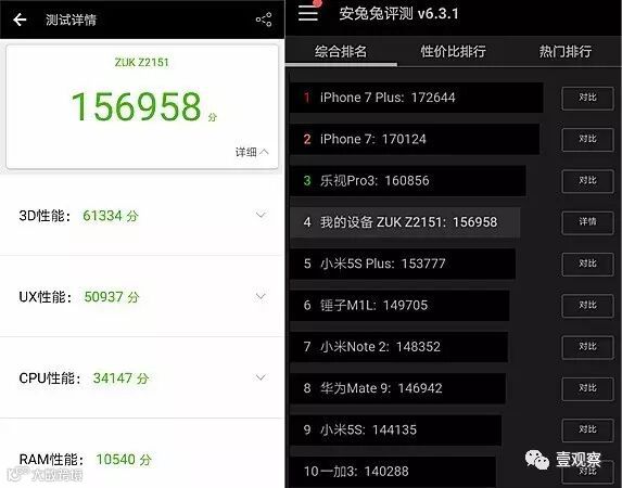 《壹观察》拿到的是6GB+64GB钛晶黑臻享版,安兔兔测试成绩达156958分,超过小米5S Plus、锤子M1L、小米Note 2、一加3等主流旗舰产品。