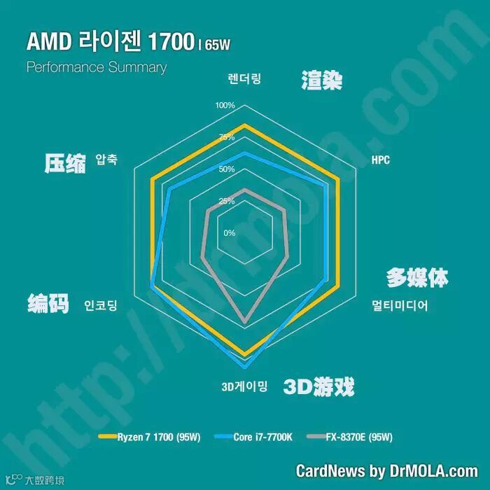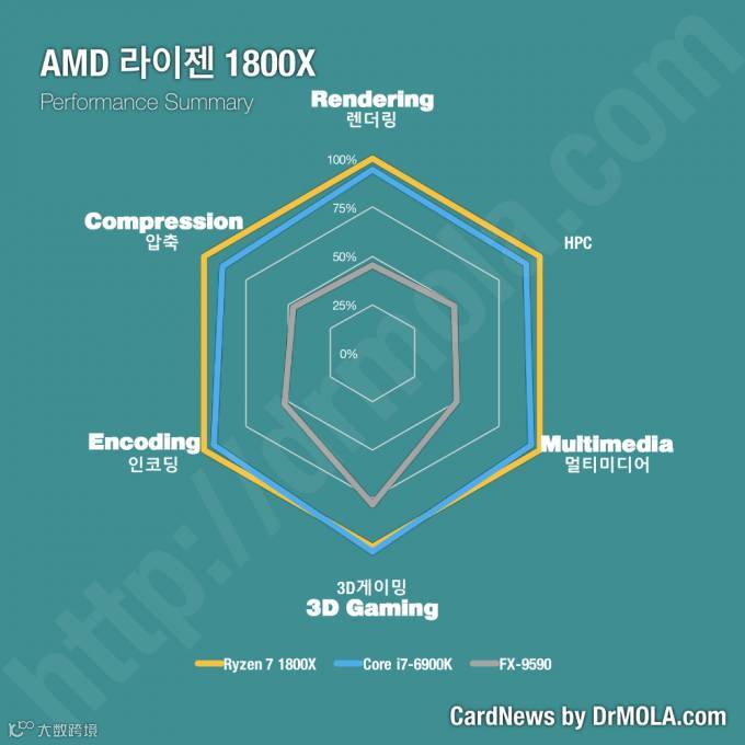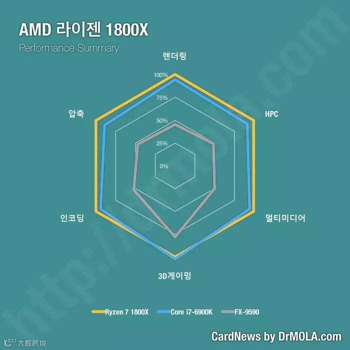 图表中使用的是韩文,不过Reddit网站上已经有热心群众给大家做了注释,最上方开始沿逆时针方向分别是渲染、压缩、编码、3D游戏、多媒体、HPC(计算性能)性能对比。了解测试内容之后,我们可以看到Ryzen 7 1800X全方位碾压前代旗舰FX-9590,号称世界首个5GHz处理器的它在后辈面前实在是没什么面子了,各方面的性能都大幅落后了。