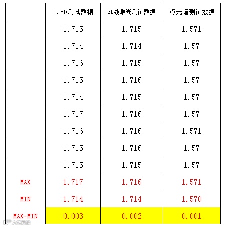 10次动态测量,2.5D重复性为0.003mm,3D线激光扫描重 复性为0.002mm。点光谱重 复性为0.001mm
