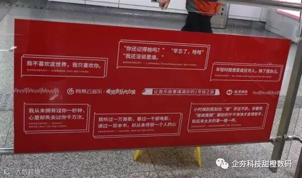 苹果iPhone 7发布了中国红版本,而杭州地铁1号线,近日也被一片红色条幅覆盖。原来,网易云音乐把点赞数最高的5000条歌曲评论,印满了杭州市地铁1号线和整个江陵路地铁站。