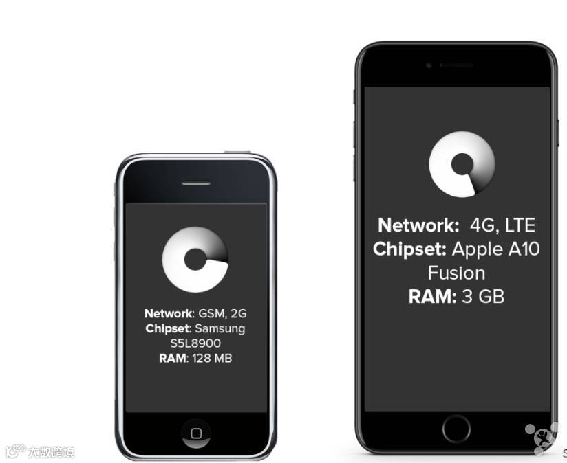 初代 iPhone 只支持 GSM,2G 网络,芯片是三星的 S5L8900,RAM 只有 128MB;iPhone 7 Plus 支持 4G,LTE,芯片是 A10 Fusion,RAM 达到了 3GB。
