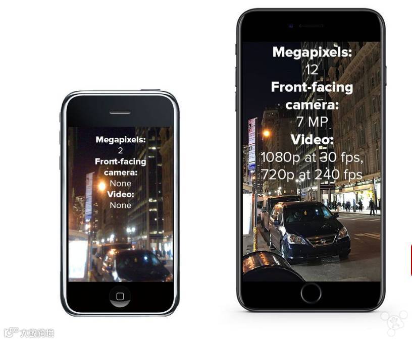 相机方面,初代 iPhone 的摄像头像素为 200 万,没有前置摄像头,不能录制视频;iPhone 7 Plus 的主摄像头像素为 1200 万,前置 700 万,可以录制视频。