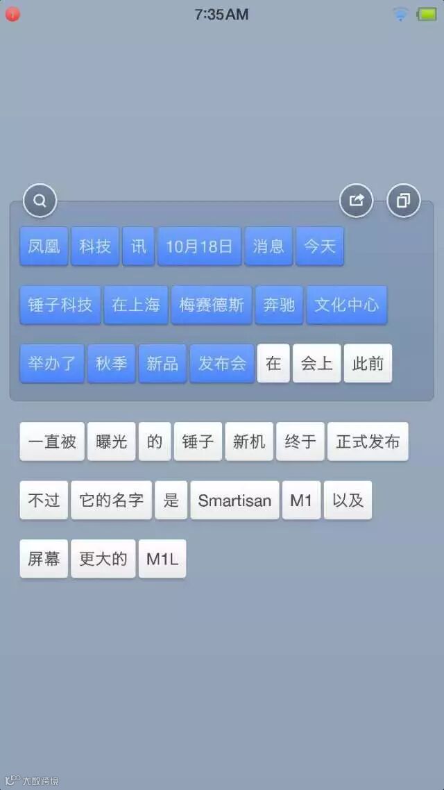 另一个要重点点赞的,是BigBang功能。在很多界面下,如果用较大面积的手指点按一段话,那么这段话不论中文还是英文,都会以词为单位快速断句,形成词语标签。