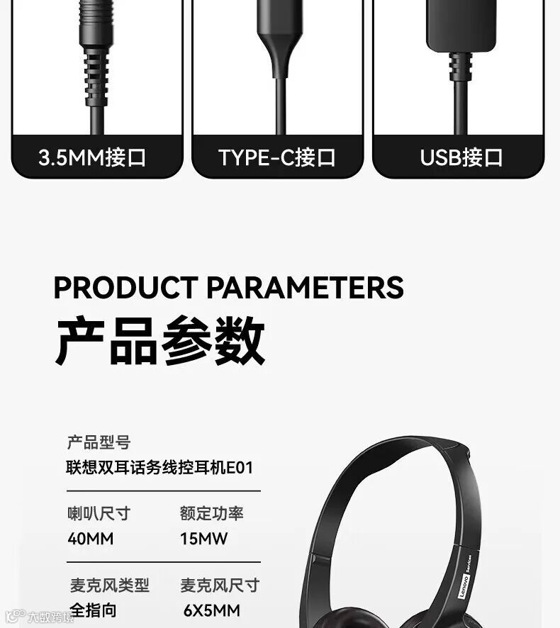 联想(lenovo) 耳机耳麦头戴式线控笔记本电脑耳麦带话筒麦克风后挂式耳机入耳式小米华为vivo苹果 E01【USB接口】【TYPE-C接口】【3.5mm单接口】 双耳带线控(40PCS/箱)