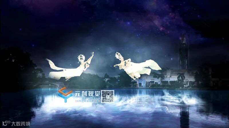 水幕激光秀还可与舞台结合,真实人物演绎结合水幕投影,带给观众虚实结合的视觉感官冲击。