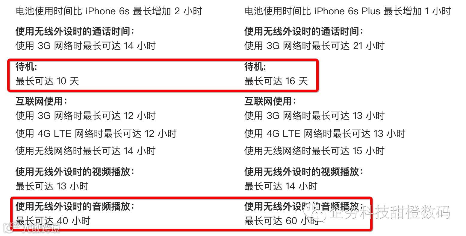 官网显示,续航方面的差距主要表现在了待机、通话和播放音乐,其他的使用环节基本在一两个小时的差距,不是特别明显。但从之前iPhone 6s的实际体验中看,Plus的表现绝对要大幅领先普通版,拿我来举例,Plus基本可以满足一天的工作和生活需求,而iPhone 6s基本到下午时就必须要充电了。