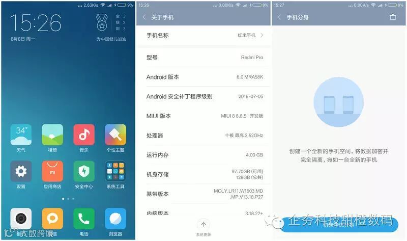这次笔者手中体验的红米Pro搭载了基于Android 6.0的MIUI8开发版。小米的MIUI经过多年的发展后,现在终于进化到了现在的MIUI8。而MIUI8在日常使用方面可以说不会有什么太大的问题,加上系统中自带了各种各样的小功能,都可以为用户提供各种便利服务。虽然说在目前的国产ROM里面有很多独具一面的精品ROM,但MIUI8在功能性以及美观性方面都属于当中的佼佼者。