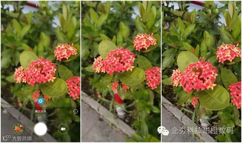 从左到右分别是虚化效果拍摄界面、开启虚化效果的成像、关闭虚化效果的成像