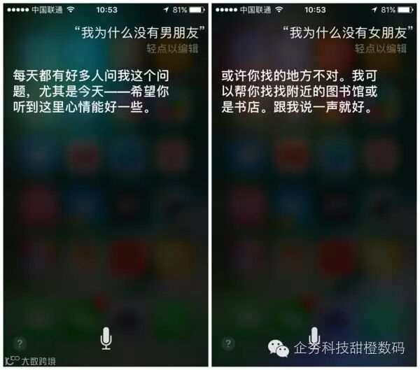 Siri:“或许你找的地方不对。我可以帮你找找附近的图书馆或是书店。跟我说一声就好。”或者“每天都有好多人问我这个问题,尤其是今天——希望你听到这里心情能好一些。”