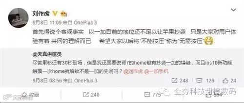 也有国产厂商的CEO对新iPhone上面的改进表示认同。有网友在微博上支出,iPhone 7的“触控式按压指纹识别”有抄袭一加的嫌疑,不过一加的掌门人刘作虎看到后的回应却十分谦虚,表示一家在手机业界的地位还不足以让苹果抄袭,这次纯属是想到一块儿而已。对于iPhone 7 home键无需按压的设计,看来刘作虎还真是有一种酒逢知己千杯少的感觉。