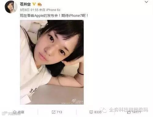 而深受宅男喜爱的苍老师在发布会进行时也表示正在看发布会的直播,还小小的表达了一下对iPhone 7的期待之情。