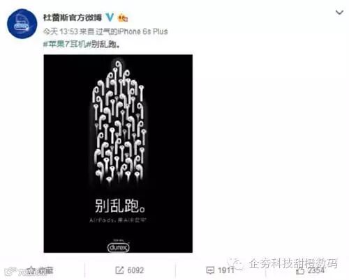 当然,除了手机厂商之外还有很多品牌或个人则是借着苹果的秋季发布会蹭了一下热门。在网上,随着新iPhone一同发布的AirPods耳机迅速成为了热点,新奇的造型让很多用户担心这款无线耳机会很容易丢失。所以,杜蕾斯官方微博就这样蹭了一下热度……