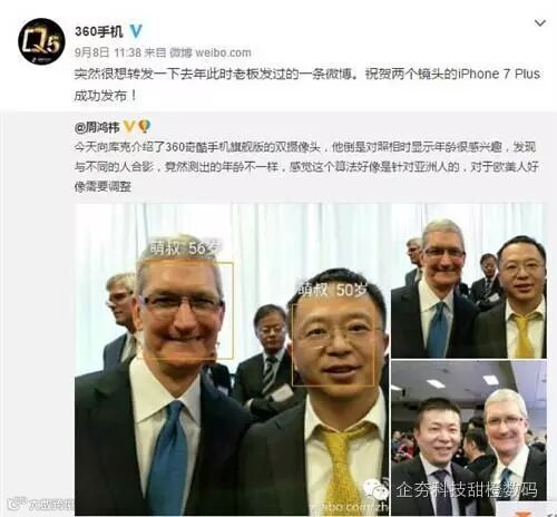 360手机官微更是扒出了教主(周鸿?)与厨子(库克)用360奇酷旗舰版的自拍合影,同样表示欢迎“两个镜头”的iPhone 7 Plus成功发布。(两个镜头这个叫法让人感觉怪怪的~)