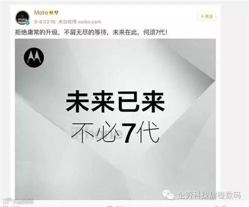 要说对iPhone 7有谁不服气,那么刚刚在国内发布了模块化手机Moto Z的Moto就是第一个举手的,手机界的新成员iPhone 7刚至,Moto官微就发文说:拒绝庸常的升级,不屑不尽的等待,未来在此,何须7代!下面的配图更是将目标直指iPhone 7。