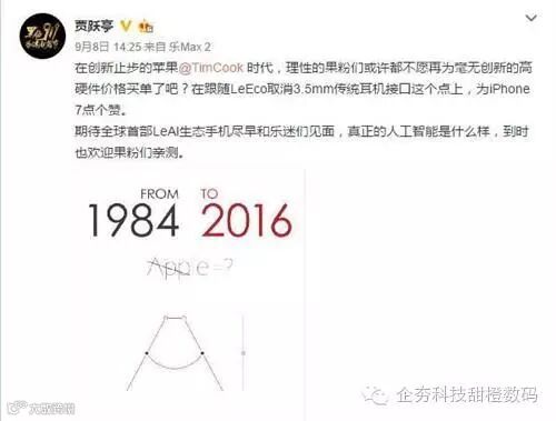 乐视的掌门人贾跃亭也在当天表明了自己的态度。一篇微博洋洋洒洒写了五行,核心思想是说自家抢先取消了3.5mm耳机接口,还顺便宣传了一下自家将发的新品LeAI生态手机;配图更是将Apple的前三个字母划掉,只留下了le,显然是指从此以后乐视才是手机创新的接班人。