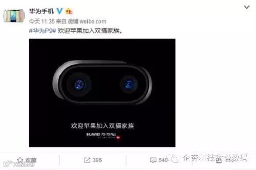 在国际市场连战连捷的华为手机官方微博欢迎苹果加入双摄家族。