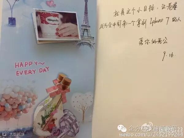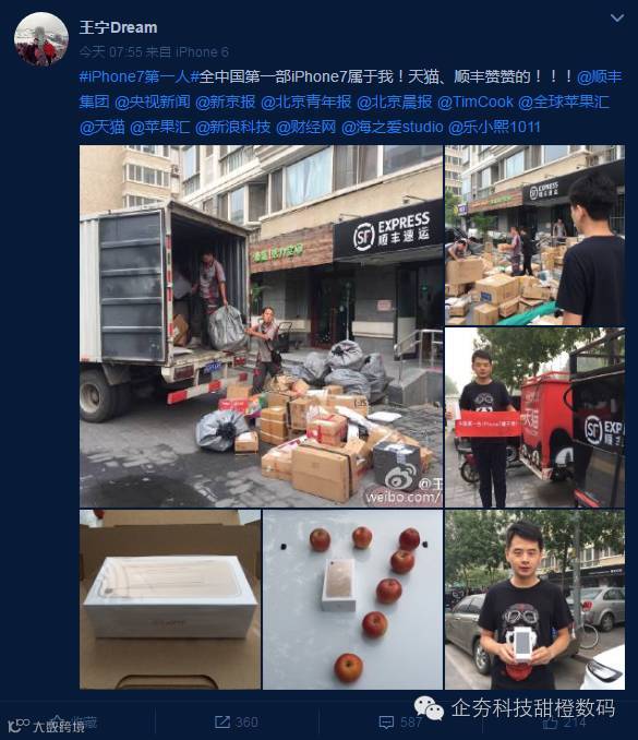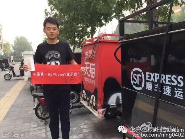 而北京网友@@王宁Dream 也发微博称 :“全中国第一部iPhone7属于我!天猫、顺丰赞赞的!!!”据了解,该网友身为资深果粉,第一时间通过某购物网站抢购到一部32G玫瑰金成为“中国第一部iPhone7” ,同时他表示将会把iPhone 7作为礼物送给自己的女友。