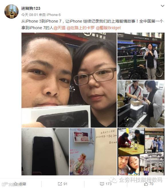 上海网友@迷糊狗123 发微博称 :“从iPhone 3到iPhone 7,让iPhone 继续记录我们的上海爱情故事!全中国第一个拿到iPhone 7的人”。照片显示,该网友到手的是一台黑色的iPhone 7,@天猫手机 官方微博还转发表示恭喜。