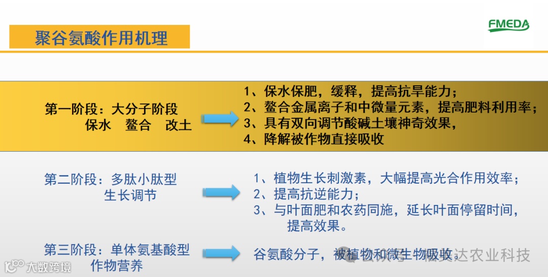 第三阶段:聚谷氨酸被降解为单体谷氨酸,作为氨基酸直接被植物吸收利用。聚谷氨酸通过以上三重功效作用促进了作物的生长。