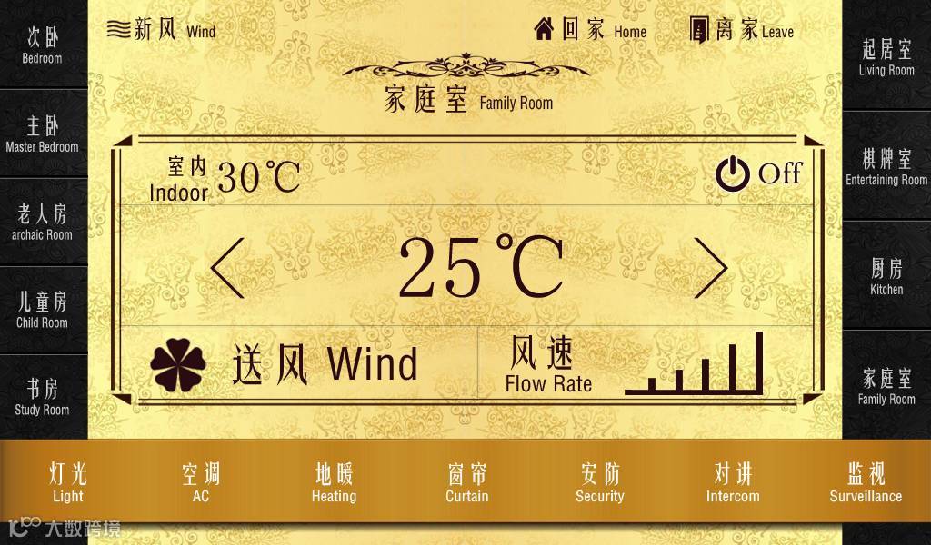 “离家”模式:轻按“离家”按钮,智能家居系统会延时关闭玄关灯光,自动关闭全屋灯光和家电,启动布防,并为您呼叫电梯。
