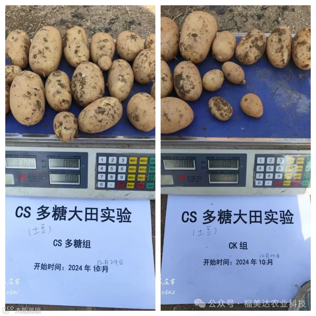 在实验中大棚土豆在12月24日种薯冒芽期冲施1.5公斤,3月初(农户忘了具体时间)冲施2公斤。通过这组试验发现,使用这种复配液的大棚土豆不仅生长更加健壮,现在还没收获,产量增加了50%。