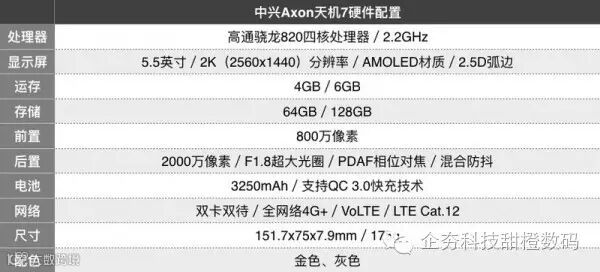 配置上,中兴Axon天机7采用高通骁龙820四核处理器,辅以4GB运存+64GB存储空间(标配版)、4GB运存+128GB存储空间(高配版)或6GB运存+128GB存储空间(顶配版)。采用一块5.5英寸2K分辨率AMOLED,表面玻璃为2.5D弧边设计,其中顶配版配备压力触控2.0技术。摄像头部分为后置2000万像素+前置800万像素摄像头组合,其中后置摄像头拥有F1.8超大光圈、混合防抖、PDAF相位对焦技术。