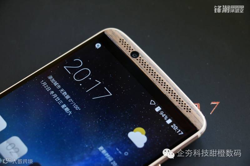 笔者本次拿到的是6GB运存+128GB存储空间的Axon天机7顶配版,虽然在机身设计上高配版和顶配版的机身设计一样,均采用的是一体式金属机身设计,但在机身装饰上仍是有所不同的。比如在手机正面上下两端的配饰,顶配版Axon天机7采用的是胡桃木装饰条,而4GB运存的高配版则采用的是金属喷砂加工。