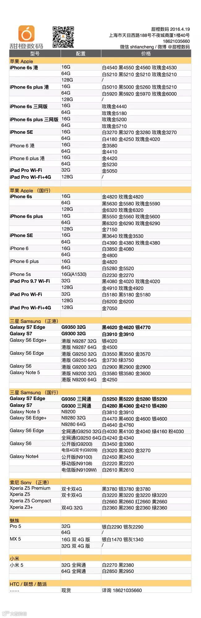 港版和国行版三星 Galaxy S7 和 S7 Edge 小幅走低 3、50 元,S6 Edge+、S6 Edge、S6、Note 5 等继续降价;iPhone 6s 及 plus 港版波动较大,国行版小幅走低;同样是新机,iPhone SE 价格坚挺,而小米 5 则在近期走低了有 100 元。
