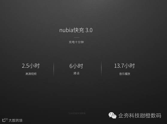 除了大电池,努比亚还为nubia Z11 Max加入了nubia快充3.0系统,可提供充电十分钟,高清视频2.5小时/通话6小时/音乐播放13.7小时的续航时间。