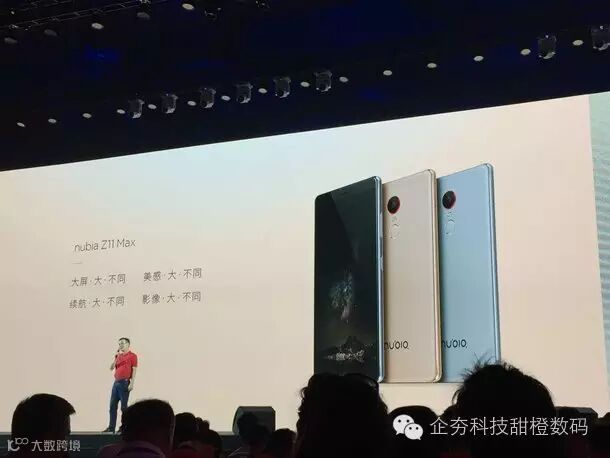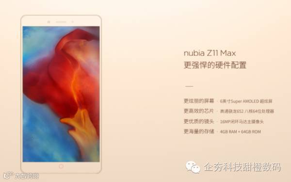在配置上,nubia Z11 Max采用了高通骁龙652处理器,6.0英寸Super AMOLED分辨率显示屏,4GB RAM+64GB ROM 内存组合,800万像素前置摄像头+1600万像素主摄像头,4000mAh电池,支持nubia快充3.0,采用独立HiFi解码芯片+功放芯片解决功放以及耳机听音乐的问题。