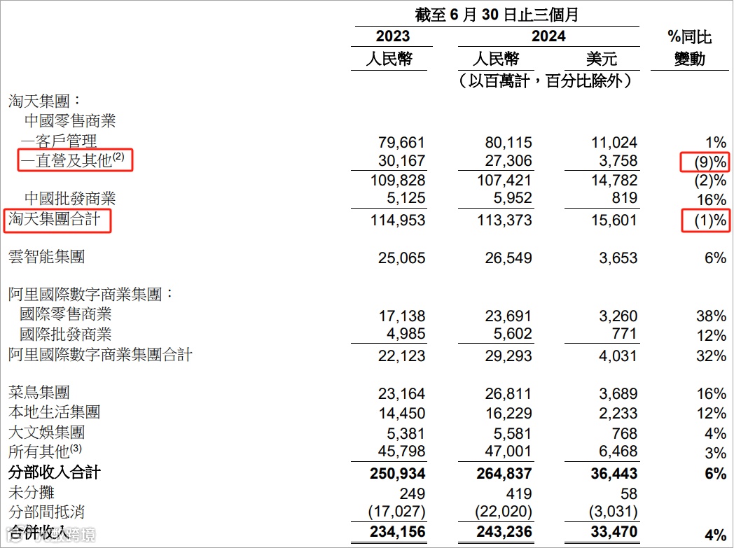 今年二季度,淘天集团收入1133.73亿,同比下跌1%,是七大业务板块中唯一下滑的。其中,直营及其他跌幅达到9%,主要是天猫超市及天猫国际。