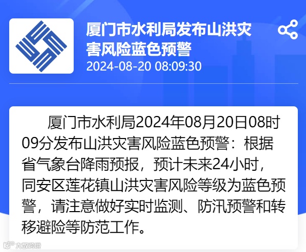 8时9分发布山洪灾害风险蓝色预警