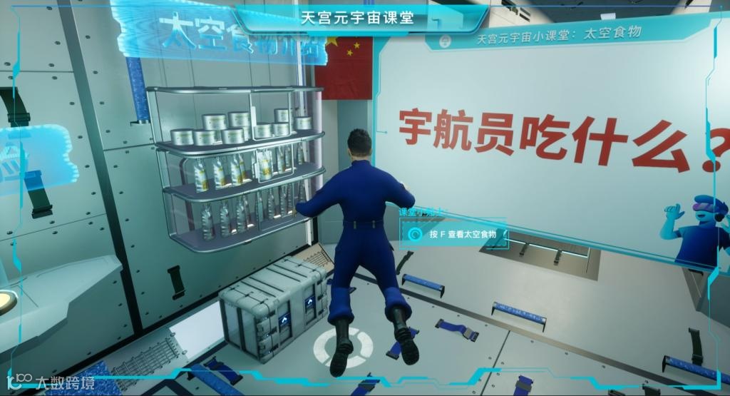 “天宫空间站元宇宙”主要包含八个课程内容板块,分别是太空单车运动、太空抛物实验、太空浮力实验、太空植物介绍、太空食物介绍、太空跑台运动、出舱/上机械臂体验、舱外地球介绍,以及相对应的体验交互触点。