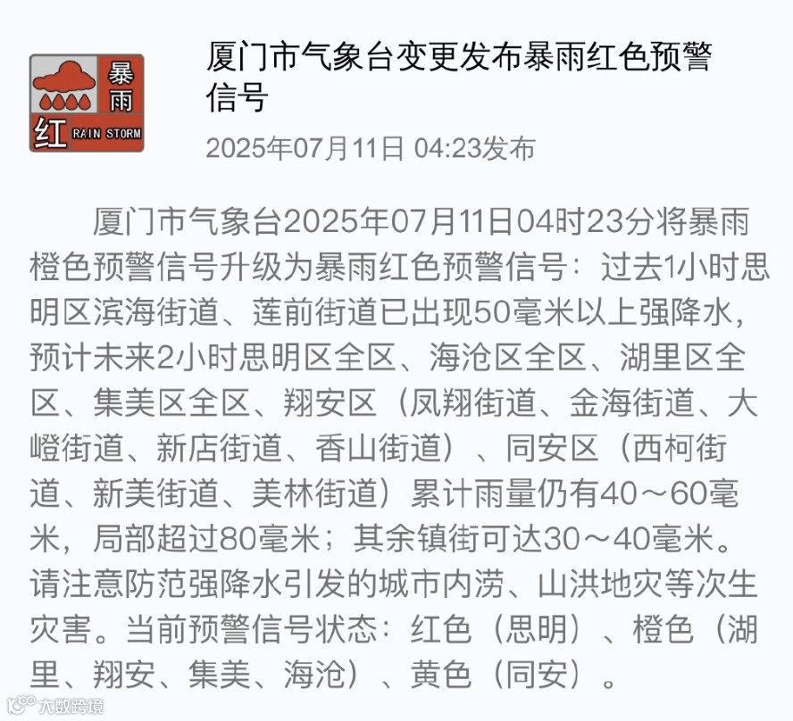 最大小时雨强出现在翔安区新圩镇73.7毫米
