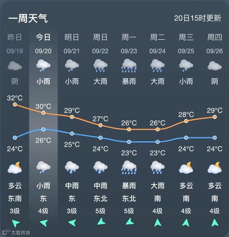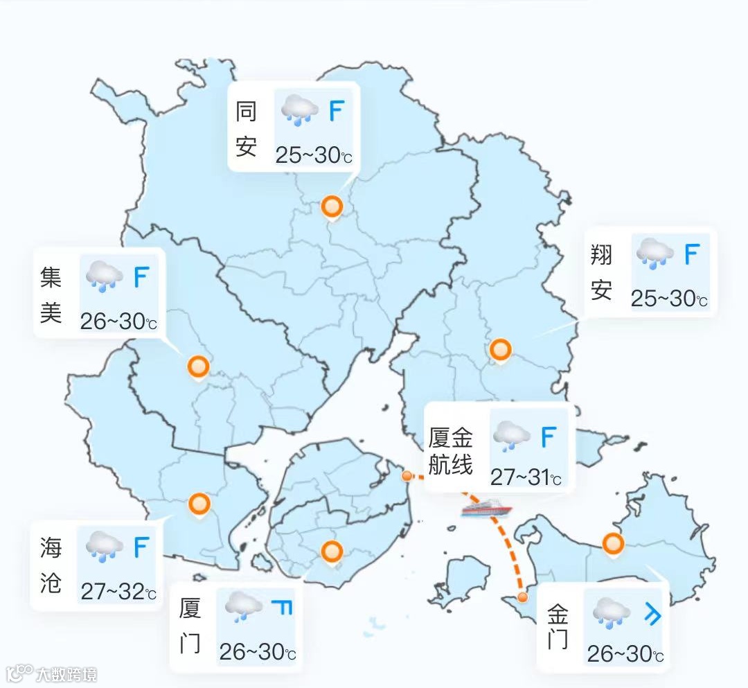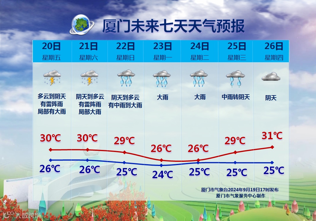 据厦门气象预报,未来7天,副高明显减弱,海上热带低值系统逐渐北抬,厦门受其影响,雨势逐渐增强,多雷阵雨天气。预计于22~24日会有大雨,降水时局地伴有雷电,短时强降水等强对流天气。出行记得备好雨具~