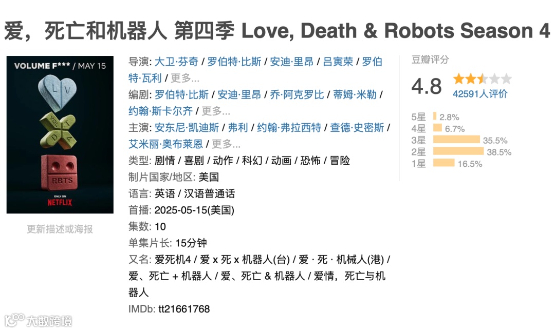 前不久,《爱,死亡和机器人》第四季回归。但口碑暴跌。第一季9.2分,最新季已经降到了4.8分,令人大跌眼镜。