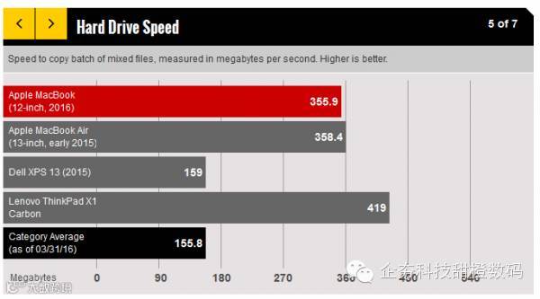 第二个来自 CNET 的测试,也没有能够将 MacBook 2015 和 2016 进行同级别进行对比,所以无实际参考意义,可以看看与竞争对手的差距。具体结果如下,你可以看到 MacBook 2016 的性能亦是中规中矩,而其中表现十分突出的似乎是微软的 Surface Pro 4。