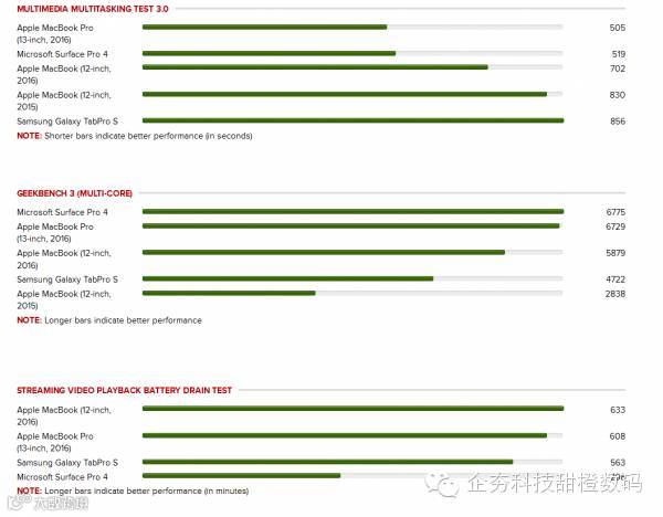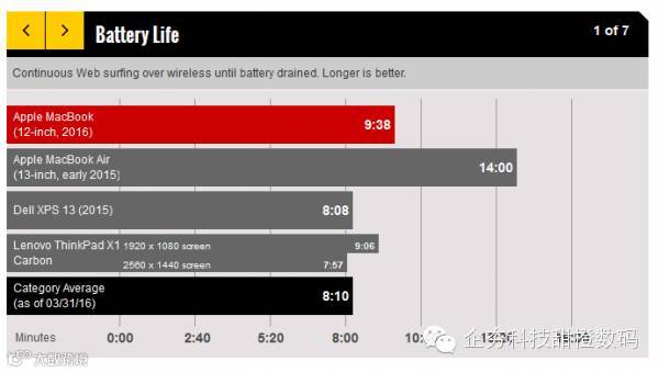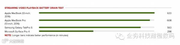CNCT 的测试则显示,全新 2016 款 MacBook 的视频播放续航时间可以达到 633 分钟,与苹果声称的“最长可达 11 小时的 iTunes 影片播放”基本吻合,说明苹果平时对续航数字的宣传相对保守,没有盲目夸大。而上面提到性能十分强大的微软 Surface Pro 4,视频播放时间仅为 298 分钟,这就与微软官方宣传的数字有明显不同了。