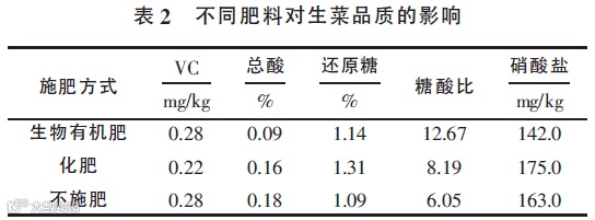 与单施化肥相比, 生物有机肥的施用可显著增加大白菜和西瓜的直径、单株(果)质量;还可改善番茄、辣椒的品质,使番茄和辣椒中维生素C 及还原糖的含量增加。通过研究不同施肥方式对生菜品质的影响, 发现施用阿姆斯生物有机肥可使生菜维生素C 含量增加,总酸降低,糖酸比显著增加,同时可显著降低易诱发癌症的硝酸盐含量(表2),在改善生菜口感、提高产品安全性方面具有重要作用。