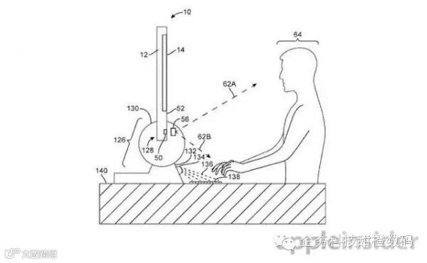 而对于这种摄像头的专利,苹果还提出了进一步应用的可能性,从专利描述图片中可以看到,一台类似于iPad Pro大小的设备被放在了摄像头底座上,并且可以检测人脸和手的角度在最适合的位置投射出虚拟键盘用来进行打字。
