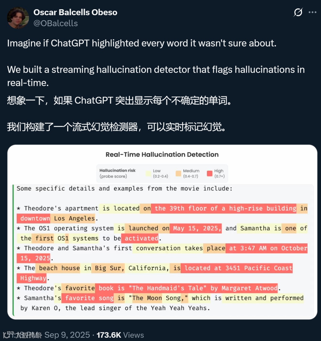 想象一下,当你向 AI 咨询一份复杂的医疗诊断建议,或是请求起草一份具有法律约束力的合同文书时,生成内容中那些看似权威的医学术语、法律条文或案例引用,却可能是 AI 凭空捏造的 "幻觉"。这种 "自信的谎言" 不仅会误导用户,在医疗、法律等高风险领域更可能造成灾难性后果。近年来,随着 GPT-5 等新一代大模型将幻觉率降低 80% 的突破性进展,AI 可靠性问题终于迎来曙光。然而,真正的信任建立不仅需要模型自身性能的提升,更需要让用户清晰识别 AI 输出中不确定的部分。苏黎世联邦理工学院(ETH)和 MATS 的研究团队提出的实体级实时幻觉检测技术,正是这一方向上的里程碑式成果,为构建人机协作的信任基石提供了全新解决方案。