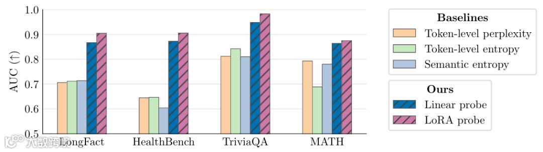 最令人惊喜的发现是该方法在分布外推理任务中的泛化能力。尽管分类器仅使用实体级标签进行训练,却能有效识别数学推理任务(MATH 数据集)中的错误答案。在这一与实体检测差异显著的任务中,该方法仍取得了强劲结果,表明其捕获的正确性信号具有超越实体检测的广泛适用性,能够识别更普遍的逻辑错误。这种跨领域泛化能力是现有幻觉检测方法难以实现的,为构建通用型 AI 可靠性系统提供了可能。