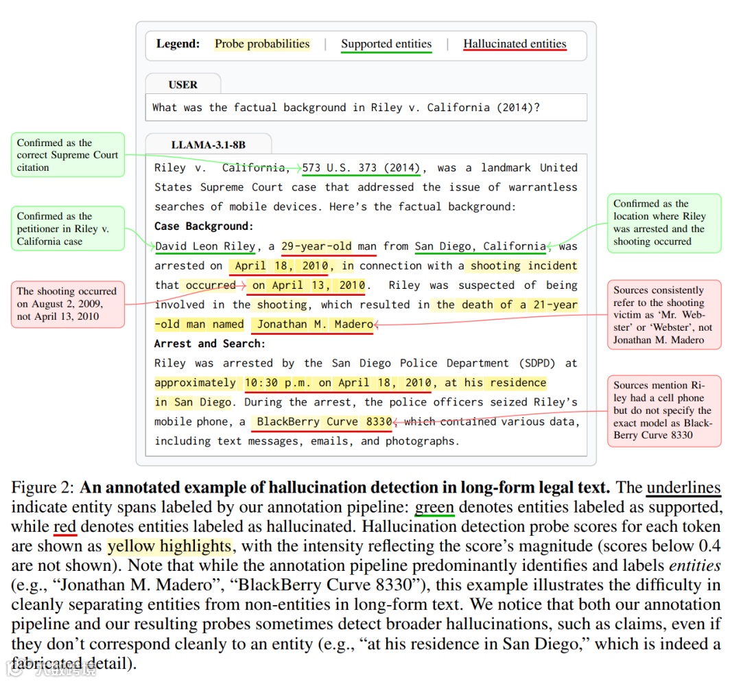 面对现有技术的局限性,ETH 和 MATS 的研究团队提出了一种全新的解决方案:聚焦实体级幻觉的实时检测。该方法的核心洞察是:在 AI 生成的错误内容中,人名、日期、引文、药物名称、法律条文编号等实体往往是最容易出错且最关键的信息单元。通过精准识别这些实体级 "幻觉 token",不仅能大幅提高检测效率,更能实现错误的精确定位,为用户提供具体的不确定性标记。