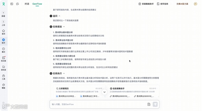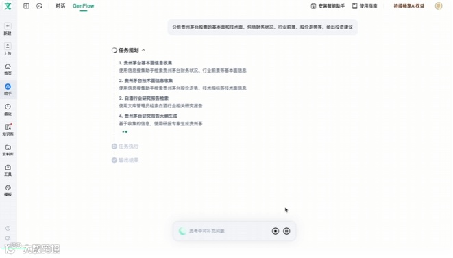 再聚焦到任务运行过程,进度条上清晰地标注着任务规划、任务执行、输出结果三个阶段,每个阶段用户都能清楚地看到系统正在进行的操作。更重要的是,GenFlow2.0 实现了让用户在任务运行过程中实时干预。当看到系统处于任务规划阶段时,若临时想到要加入其他对标股票的对比分析,只需点击 “暂停” 按钮 —— 注意并非 “终止” 按钮,就能补充需求,随时介入任务运行过程。这在很大程度上能避免用户第一次输入需求不够完整、有细节变化,或是需要纠正 AI 分析思路偏差等问题,极大地提升了操作的灵活性和结果的准确性。