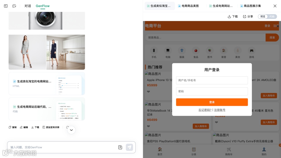 从电商网站需求分析的任务规划界面,能清晰看到 GenFlow2.0 如何将一个宏大的需求分解成具体的执行矩阵。这里不仅有 “脑图专家” 画出电商网站主要功能和设计要素框架,还有 “图表专家” 制作电商网站系统架构设计图,其中包括对用户核心体系和系统核心组件的分析。之后,GenFlow2.0 会调用代码 Agent 和生图 Agent,分别生成前后端代码、创建商品图片,最终呈现出一个包含商品分类、热门推荐、购物车、用户登录等完整模块的网站,整个过程有条不紊,展现出强大的任务拆解与执行能力。