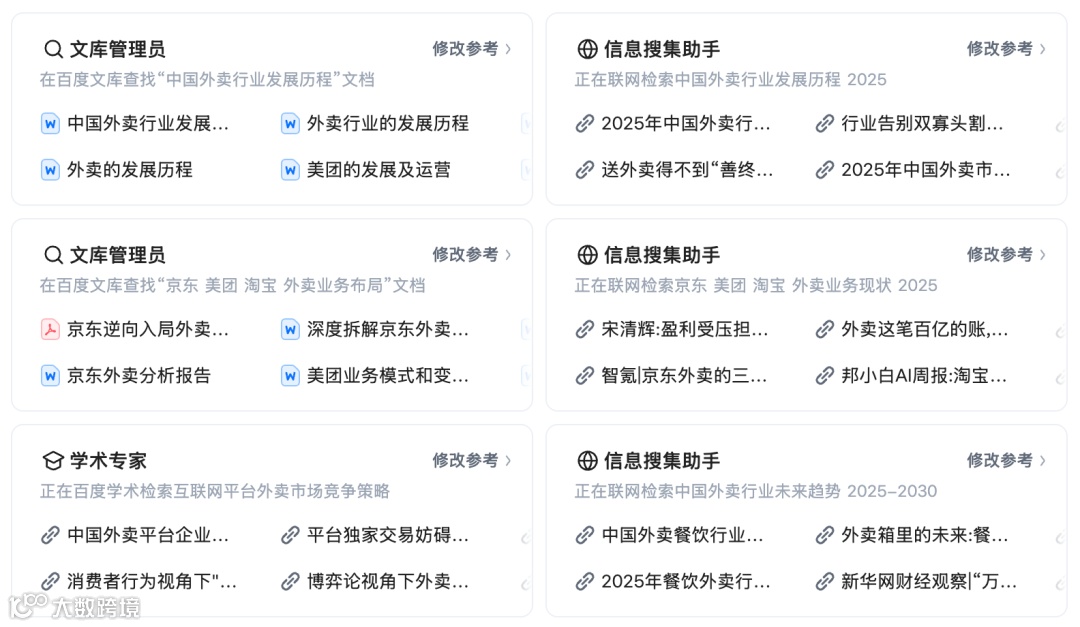 其中,搜索 Agent 深度集成了百度搜索、百度学术和文库资源,它如同一个经验丰富的研究者,清楚地知道什么时候该去学术库寻找专业论文,什么时候该去财经频道搜集最新新闻;数据 Agent 则专门负责处理各种格式的结构化信息,无论是 PDF 财报、Excel 数据表,还是 API 接口,它都能精准提取关键数据,比如准确抓取京东集团 2025 年 Q2 营收 3567 亿元这类精确信息;分析 Agent 运行着各种金融模型,从基础的 PE 估值到复杂的蒙特卡洛模拟,都在其能力范畴之内;创作 Agent 则像一位资深的文案专家,掌握着不同文体的写作规范,咨询报告的专业语气、研究论文的引用格式,它都了然于心;格式 Agent 则专注于细节,确保每个标题的字号、每张图表的位置都符合专业标准。